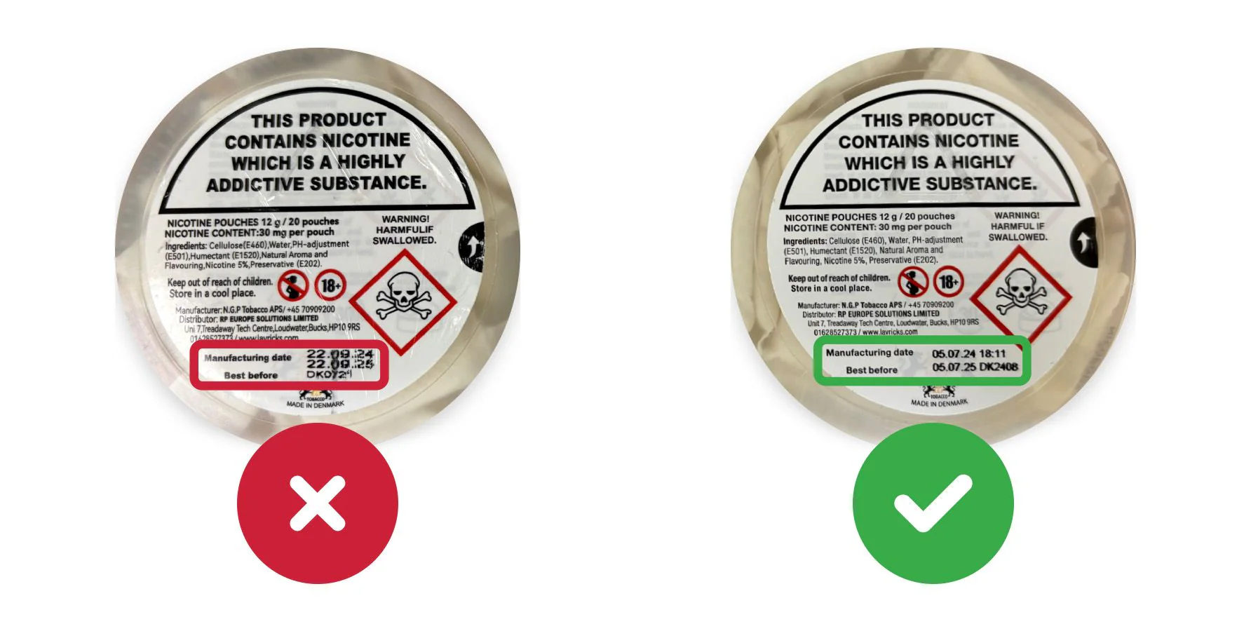 Start with the batch number. Legitimate nicotine pouches should have a clearly printed batch or production code on the can. If the batch number is missing, poorly printed, or unreadable, that is an immediate red flag. When in doubt, you can contact the manufacturer directly and provide the batch number to confirm whether the product matches a real production run.